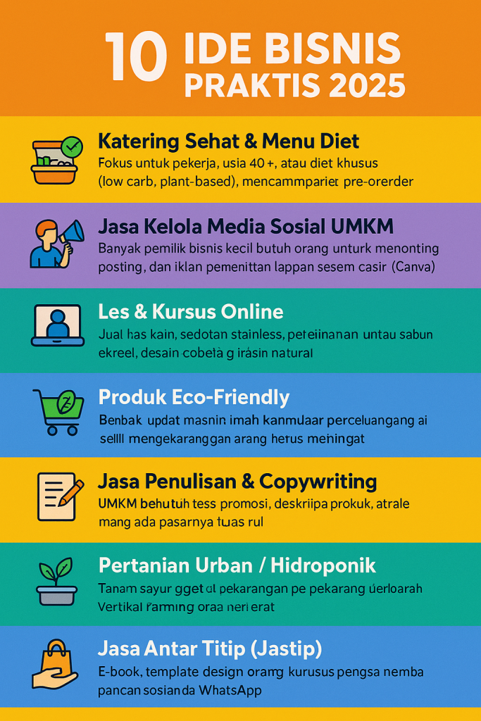 Berikut 10 ide bisnis praktis tahun 2025 yang bisa dijalankan di Indonesia dengan modal kecil: